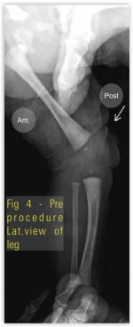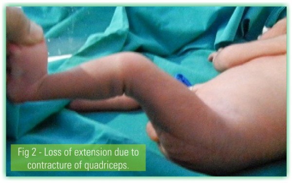 Congenital knee dislocation (CDK) is a rare malformation characterized by hyperextension of the knee and marked limitation of flexion with associated anomalies. The Chanssier first reported about such case in 1812 followed by Swiss physician Chatelaine in 1822 [1]. Diagnosis is simple and can be done by checking the hyperextension at the knee and palpating the excessively prominent femoral condyles. The estimated incidence of this anomaly is 1:100000 live birth second to incidence of CDH. Combination of CDK and DDH quite rare. Congenital hyperextension of the knee can be divided into three grades (By Laurence) [2] according to severity: grade 1, congenital hyperextension; grade 2, congenital hyperextension with anterior subluxation of the tibia on the femur; and grade 3, congenital hyperextension with anterior dislocation of the tibia on the femur [1].The etiological factor for genu recurvatum are still not known in details but factors which have contributed are breech position, lack of intrauterine space, trauma to mother, quadriceps contracture or fibrosis, absence of suprapatellar pouch, deficient or hypoplastic ACL [3]. Except these intrinsic causes there are also extrinsic factors which can lead to genu recurvatum this include intrauterine pressure leading to malposition of knee and foot. A combination of intrauterine pressure build up with reduced intrauterine space may lead to ‘packaging disorder’ causing malposition of multiple joints like hip, knee and foot too. Spontaneous reduction has been mentioned with extrinsic causes while the intrinsic causes may be finally tackled with surgery but this may not be always true [4]. We present one such case with multiple dislocation of joints in a new born involving congenital genu recurvatum of left knee joint with bilateral congenital hip dysplasia with quadriceps contracture with CTEV.