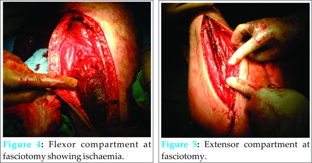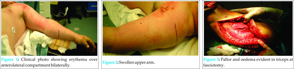 He was taken to theatre after compartment pressures were performed for fasciotomy of the upper limb. Long incisions were made over the volar aspect and extensor aspects of the forearm. Within the flexor compartment of the forearm, the muscle was non-reactive and clinically ischaemic. Within the extensor compartment of the forearm, a similar picture of pinpoint haemorrhage, ischaemia and lack of reactivity to electrical stimulation was noted. In the biceps compartment, there was pallor of biceps brachii, with mild reactivity, and ischaemia of brachialis. The medial neurovascular bundle was grossly swollen with tight fascia. This was released. The extensor compartment of the upper arm showed bleeding into the tissues and minimal reactivity to electricity. All compartments were fully released.