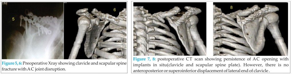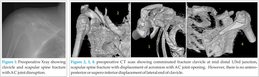 38 year male met with road traffic accident while being hit by heavy four wheeler while walking by the side of road. He sustained injury overhead and right shoulder. Patient was treated for head injury elsewhere and later he came to our institution for shoulder injury. On presentation, there was gross swelling over right shoulder with ecchymosis with tenderness over midclavicle, AC joint and over scapular spine region. There was no distal neurovascular deficit. X rays revealed, clavicle fracture comminuted at mid-distal one-third junction with scapular spine fracture alongwith acromioclavicular joint disruption(Fig 1). CT(Computed Tomography)scan showed lateral fragment of clavicle displaced inferiorly with communition at fracture site and medial fragment displaced superiorly. Acromion process was displaced slightly infero-posteriorly opening AC joint (Fig 2,3,4)