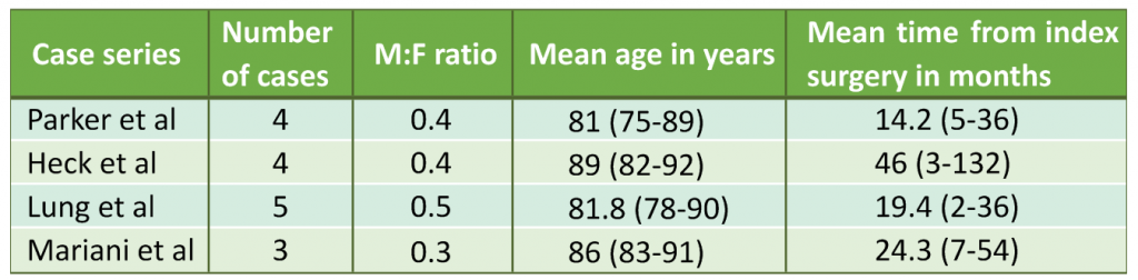 Considering there are only case reports and small case series reporting this complication we decided to pool the available data in order to look for any risk factors. Papers from which data was analysed included Parker et al , Heck et al , Lung et al , Mariani et al and the case that we are reporting. All 17 cases were female with an average age of 84.5 years (75-92 years), at the time of diagnosis of intracapsular fracture. There was history of trauma only in 5 cases (29.5%). We need to bear in mind that these are osteoporotic fractures and the trauma patient sustained may be so trivial that they might not be able to recall it. The mean time from index surgery to second fracture was 23.4 months (2-132months). Subsequent surgery involved hemiarthroplasty in 12, THR in 2, no data available for 2, and 1 patient was deemed unfit for second surgery.