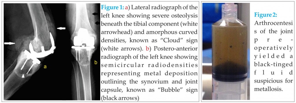 Helito CP, Buarque de Gusmão CV, Angelini FJ et al. Severe metallosis following total knee arthroplasty: a case report and review of radiographic signs. Skeletal Radiol. 2014 Aug; 43(8):1169-73. [Google Scholar] [PubMed]