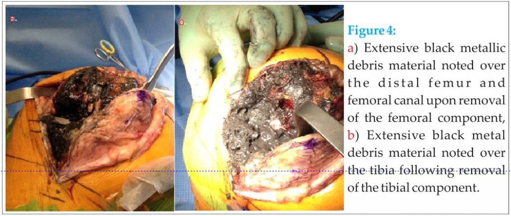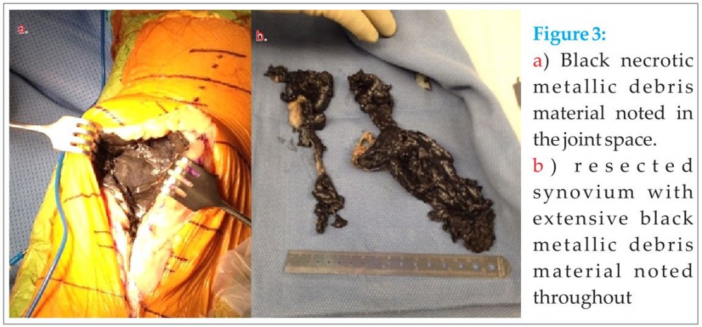 Metallosis occurs when periprosthetic soft tissues, synovium, and/or bone is infiltrated by metallic debris secondary to metal-on-metal wear. This debris can cause a chronic inflammatory reaction leading to joint instability, pain, and swelling, and may cause osteolysis, implant loosening and ultimately implant failure. Metallosis is well documented in the total hip arthroplasty literature, mainly from the use of metal heads and liners. However, this condition is much less common following primary total knee arthroplasty (TKA). The TKA literature is limited to mainly case reports and series with patients generally presenting with chronic symptoms between 5 to 10 years out from the primary procedure [1-8].