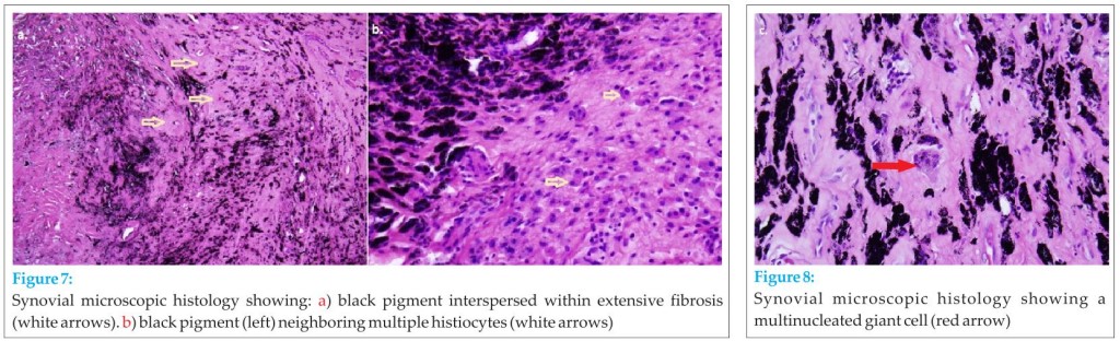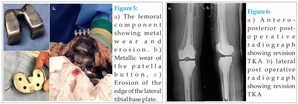 Metallosis can be suspected pre-operatively with radiographic signs such as the “cloud sign,” “bubble sign” and the “metal-line signs”, with our patient displaying the former two on lateral and PA radiograph images. The “cloud” sign is the most commonly cited radiographic indication of possible metallosis and is described as amorphous, fluffy densities in periprosthetic soft tissues, most commonly found posterior to the knee implant [1,2,5] Additionally, bubbly appearing radiodensities representing metal deposition outlining the synovium are known as the “bubble” sign. Finally, the “metal-line” sign is a thin linear radiodense line that outlines part of the joint capsule (most commonly in the suprapatellar pouch) and is fairly specific for metal-induced synovitis. Evidence of these signs on imaging should prompt a close evaluation for metallosis. Serology and arthrocentesis also need to be performed to rule out infectious etiology. In general, a peripheral WBC count is not useful diagnostic measure since it is generally normal in TKA infections while persistent elevation of ESR, with abnormal levels defined as > 30 mm/hr three months to one year after TKA, is often indicative of infection (specificity of 87%) [9]. Similarly, elevated CRP levels defined as > 10 pg/ml at least 14-21 days after TKA also point to an infectious etiology (specificity 83%) [9]. Regarding synovial fluid leukocyte count and differential, the numbers to consider a possible infection, include > 1100 WBC/ml with a PMN percentage > 64% (88% and 94% specificity, respectively) [10-11]. As such, in the presence of radiographic signs of metallosis and absence of infectious markers, a diagnosis of metallosis can be made with relative accuracy [4,5,7,8].