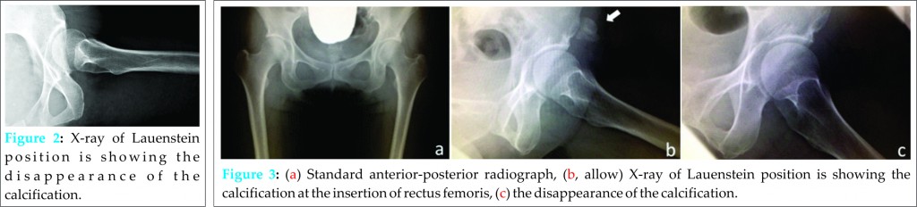 A 40-year-old female woman presented to our clinic following a 2 weeks episode of intermittent severe right hip pain (rated 9/10 on VAS), which was relieved by taking oral NSAIDs, clinically active hip flexion was restricted. Radiographic examination revealed the calcification at the inferior, anterior iliac spine (Fig. 3). Because she had severe pain regardless of taking NSAIDs, 3 ml of 1% xylocaine and 1.65 mg of methylprednisolone were injected into the inferior, anterior iliac spine. After 1-week the injection VAS became 0 and no restriction of hip motion was observed. Standard radiography after 8 weeks revealed complete absorption of the calcification (Fig. 3). Clinical review 1-year after her injection showed no reoccurrence of her symptoms.