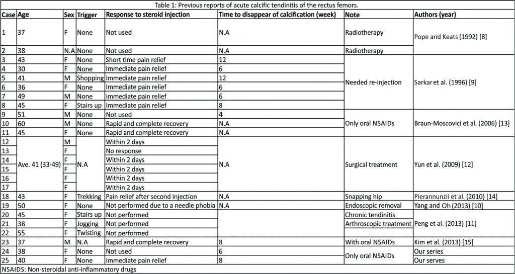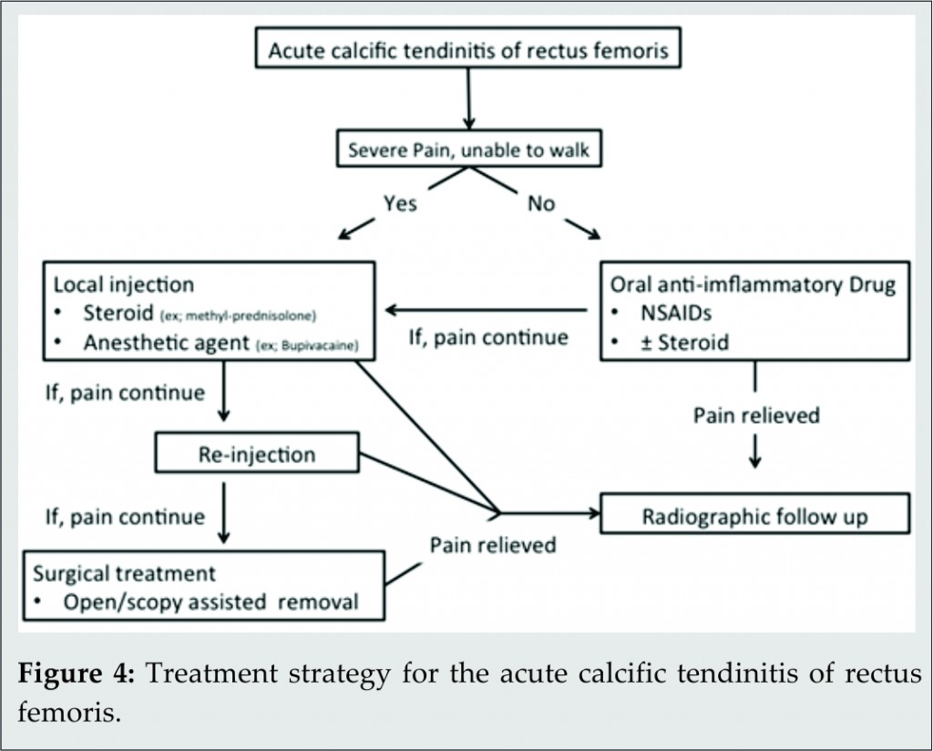 Introduction: Periarticular calcific tendinitis is a common cause of Orthopedic outpatient referral. Calcific tendinitis of the rectus femoris, however, is very rare and not well known. Due to its rarity, correct diagnosis and prompt treatment are not fully understood.