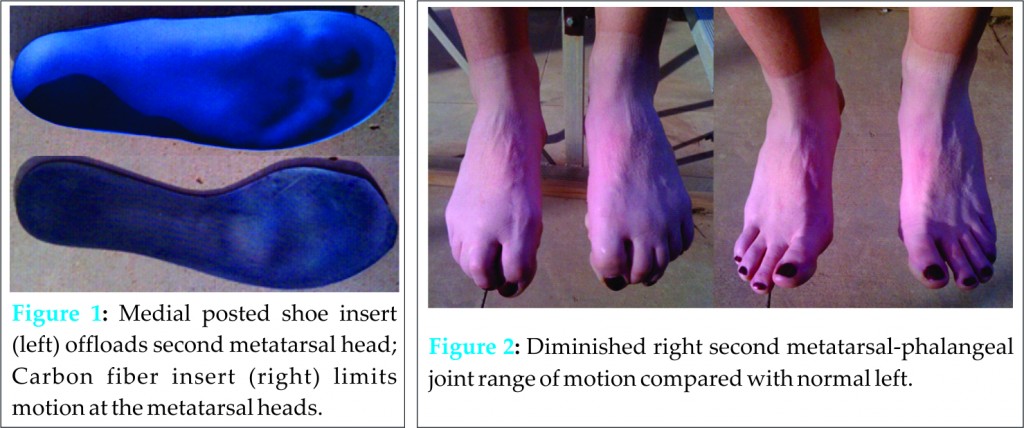 The patient is a 20 year old female tennis player who presented with a complaint of worsening of her chronic foot pain. She stated that she had a condition with a “funny name” affecting her right foot that began around age thirteen. The condition caused pain in the top of her foot that worsened when she participated in tennis. Forcefully pushing off on the right foot, while making lateral direction changes from right to left, exacerbated her pain. The pain previously occurred only with tennis but for over a year had been present most of the time with variable intensity. The quality of the pain was aching and usually only moderate in intensity. It did not affect her activities of daily living but had affected her practice. She guarded against putting direct pressure on the mid foot by planting more medially or laterally during direction change in practice. She did not let the pain affect her push off during competition and usually had the most severe pain post competitive play. She had recently increased the intensity of her practices from a relative rest over the summer. She denied any mechanical symptoms of the foot. She had used various over the counter non steroidal anti inflammatory medications without much relief. She did get some relief from prescription carbon fiber shoe inserts and padded insole supports (Fig 1), prescribed by a podiatrist, and regularly replaced her tennis shoes. She wanted to know if anything more could be done to relieve her pain. She had a past medical history of forearm fracture at around one year of age. Her family history was non-contributory. Her social history found that she enjoyed competitive tennis, was doing well in school, and denied substance abuse. Review of symptoms was negative. She was a healthy appearing female. There were no lower extremity color changes or edema. Ankles had symmetric active eversion, inversion, dorsiflexion and plantarflexion. Active dorsiflexion and plantarflexion of the toes revealed a limitation in the range of motion of the second toe of the right foot (Fig 2). Passive dorsiflexion of the second toe was blocked at 30 degrees and plantarflexion was painful at 30 degrees. She had dorsal and plantar tenderness to palpation over a bony deformity at the second metatarsophalangeal joint but no other tarsal, metatarsal or phalangeal tenderness. Single leg toe raise was painful on the right. She had normal arches and gait. The lower extremity neurovascular exam was normal.