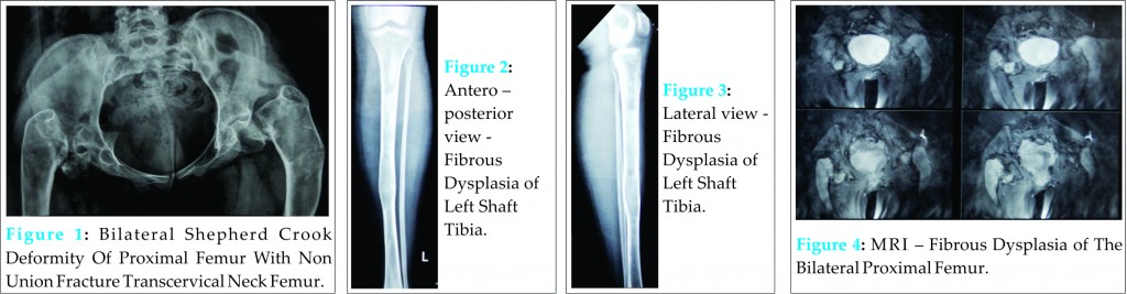 Introduction: Fibrous dysplasia is a rare benign disorder of the skeletal system characterized by fibro osseous proliferation with intervening areas of normal or immature bone in the intramedullary region. It can either be a monostotic (involves one bone) or a polyostotic (involves more than one bone) presentation and usually occurs equally in males and females. Deformities like scoliosis and shepherd’s crook deformity are frequently encountered in the polyostotic form. We report a rare managed case of bilateral non-union of the pathological fracture of femur neck with shepherd’s crook deformity of the proximal femur in a case of polyostotic fibrous dysplasia.