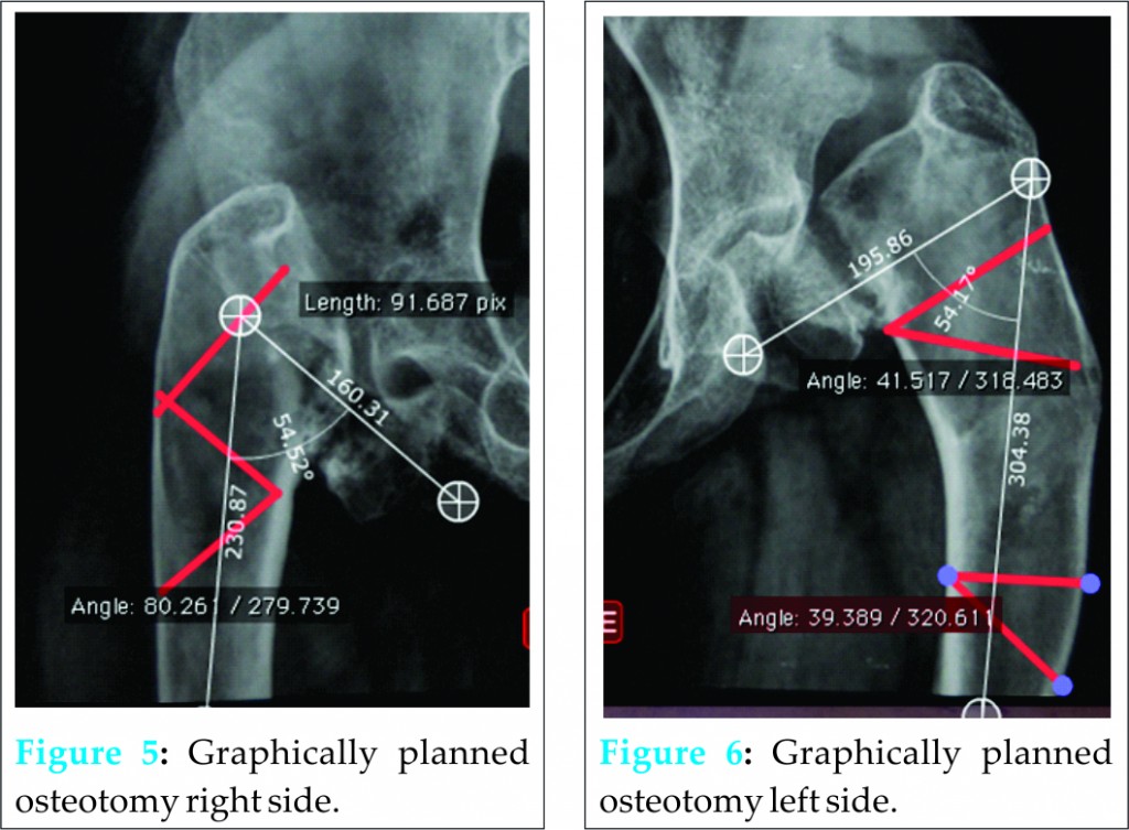 It was decided to do both correction of the deformity to realign the head, neck and shaft; and to achieve valgus at the neck – shaft region and a horizontal configuration neck fracture increasing the chances of union of pathological fracture of neck femur, in one stage, each side at a time. On the right side, first oblique osteotomy was done from just distal to the greater trochanter up to the level of the neck to separate the greater trochanter and the second, lateral closing wedge abduction osteotomy was done at the subtrochanteric level to achieve alignment of the shaft with the proximal femur. With traction neck was aligned to the head and fixed with a 135° Dynamic Richard’s screw with a long side plate. The high riding greater trochanter was aligned with the neck and held with a tension band wire from above and medial to the abductors to hold the greater trochanter aligned.