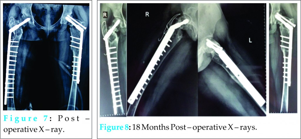 2 months later on the left side double lateral closing wedge abduction osteotomies were performed both at the subtrochanteric level to achieve the valgus at the neck – proximal femur shaft junction and to align the distal shaft with the proximal femur. After full correction the head and neck were aligned and the vertical geometry of pathological fracture neck femur was converted into a more horizontal one increasing the chances of union of the fracture. Fixation was done using a 135° Dynamic Richard’s screw with a long side plate to span both the osteotomy sites. Post – operatively we achieved a neck shaft angle of 135° on right side and 133° on the left side (Fig 5). Patient was started on active and passive quadriceps strengthening exercises and after 6 weeks of immobilization toe touch weight bearing was started followed gradually by partial and complete weight bearing mobilization. Follow up imaging showed union at both the osteotomy sites bilaterally and also at the site of the pathological fracture of neck femur. Presently, at 18 months post – operatively (Fig 6), patient is walking full weight bearing without support and there are no signs of recurrence of lesions of fibrous dysplasia or the deformity.