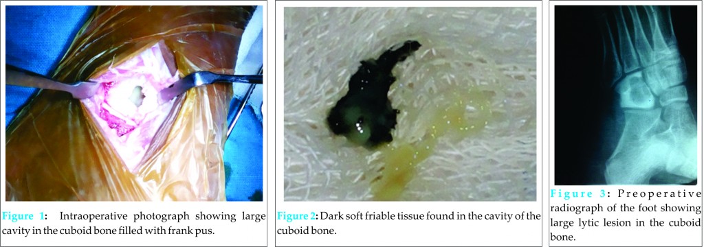 A cavity filled with yellowish frank purulent fluid (Fig. 1) along with small dark soft friable tissue (Fig. 2), surrounded by thick hard bony wall was found in the cuboid bone.