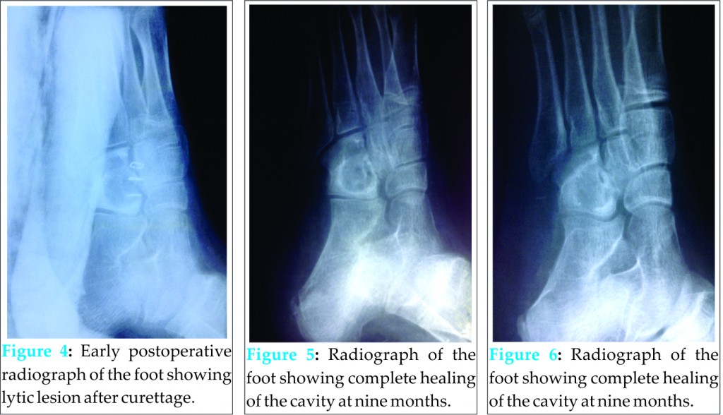 It was curetted till the appearance of punctate bleeding and the wound was closed over Penrose-type drain. Pus culture isolated S. pyogenes, and the dark tissue, on histological examination, revealed dense acute inflammation with foamy histiocytes and fragments of viable bone suggestive of an abscess. On follow-up, he showed complete resolution of disease without recurrence and complete radiological healing was achieved at 9 months (Figs. 3-6).