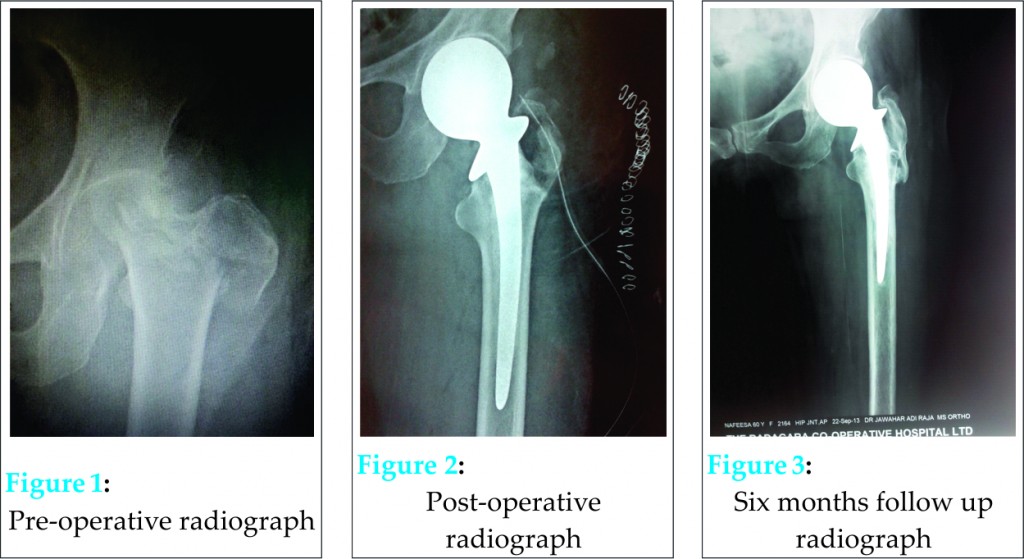 Dislocation of hip usually occurs as a result of high energy trauma and is often associated with injury to head of femur or acetabulum [4]. An additional acetabular fracture occurs if longitudinal forces are stronger than adduction forces. But if longitudinal force is combined with adduction force, neck of femur gets fractured especially in osteoporotic bone [5]. Our patient might have been subjected to considerable rotational force which caused this very rare pattern of injury. We believe that first mechanism was longitudinal force which was then supervened by adduction and external rotation force leading to anterior dislocation of hip and associated fracture of neck and trochanter of the femur. Such injuries are orthopedic emergencies and require immediate surgical intervention [5].Up to 1/3 of these cases can lead to osteonecrosis of the head of the femur especially if associated with severe bone destruction as in our case [2]. As there was comminution of trochanter and the entire neck was involved by the fracture pattern, open reduction was not attempted. Head of the femur along with attached part of the neck was removed. Remnant neck was nibbled out and cemented hemiarthroplasty performed (Fig.2). The avulsed greater trochanter fragment which got fallen back by itself after reduction of the hip was stabilized with thick (No.1) absorbable sutures of Monofilament Polydioxide (PDS) material. Walker assisted mobilization was started on 5th post-operative day;non-weight bearing for three weeks and then gradually increasing partial weight bearing walking. At six months follow up after surgery, the radiograph (Fig.3) of the operated hip showed near normal joint anatomy and good functional outcome.