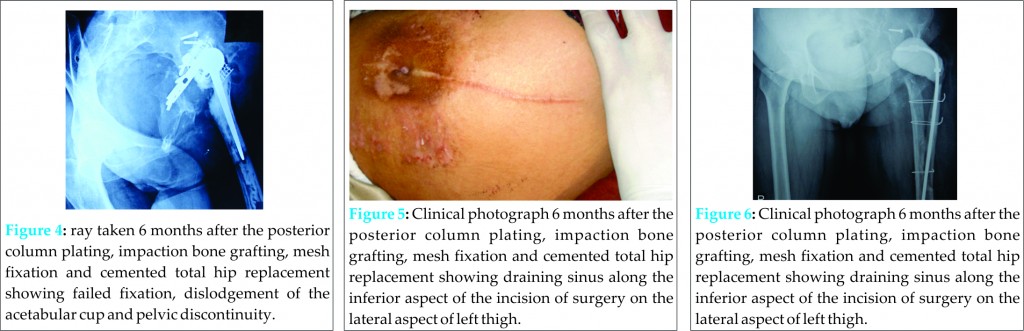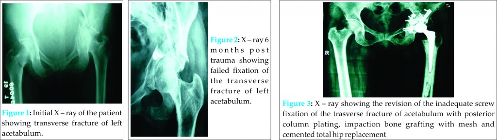 40 years old female presented with transverse fracture of left acetabulum (Fig 1). Patient was managed elsewhere with anterior extended ilio-inguinal approach, with inadequate single screw fixation. The fixation failed (Fig 2). She presented 6 months later with painful hip. The patient was managed with reconstruction of acetabulum by posterior column plating, impaction bone grafting; from the morselized bone grafts harvested from the femoral head, fixed with mesh and multiple screws spanning both the columns of acetabulum [5]; and a cemented total hip replacement implant (Fig 3). The mesh acted as internal buttress splint as well as protected the bone grafts. As posterior column is the main weight- bearing pillar during walking, posterior column plating was done to support posterior column union. Autologous bone grafts used for filling up the central defect gave support to the cemented cup. Patient was asked to weight bear with a walker till bone grafts consolidated. Post – operative course of patient was uneventful.