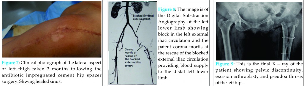 Postoperatively digital subtraction angiography of affected limb demonstrated chronic block in the external iliac artery and vascularity of the limb was being maintained by corona mortis [7], receiving blood supply from the obturator artery, a branch of internal iliac artery (Fig 8). Retrospectively analyzing, this case at no point of time did have any signs, which could have suggested vascular insufficiency in the lower limb. Patient was ultimately left with pelvic discontinuity, excision arthroplasty and pseudoarthrosis of the left hip (Figs 9 &10).