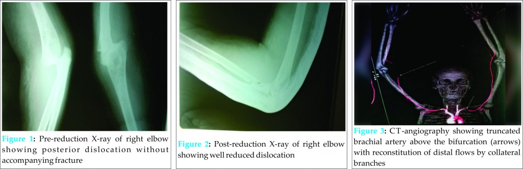Elbow dislocation is the most frequently encountered presentation after shoulder dislocation [1]. The most common mechanism of injury is fall on outstretched hand that forces elbow into hyperextension. Types of elbow dislocations are anterior, posterior, postero-medial, postero-lateral, lateral, medial and divergent. Vascular injury associated with elbow dislocations are rare [2], and it usually occurs along with open dislocation, anterior dislocation, penetrating injuries, dislocations associated with fracture [3]. Vascular injury is usually evident from ischemic clinical picture that includes absence of distal pulses, pale hand, cold extremity and diminished sensation. However, sometimes complete brachial artery transection can be present with well per-fused limb, palpable radial artery and normal capillary refilling time because of rich collateral circulation around the elbow [4,5].