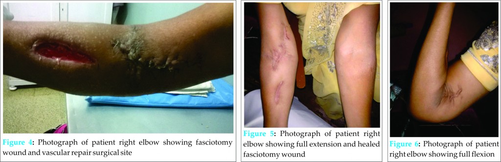 In recent times CT- angiography is more commonly used to evaluate the vascular injury. Typical angiographic findings include long segment of abruptly occluded flow usually about 5-6 cm above the elbow. Active contrast extravasation may not be present due to intraluminal thrombi. Duplex USG has been shown to be accurate for detecting significant vascular injuries. In addition, duplex USG can differentiate arterial transection from entrapment or thrombosis by detecting gap between two transected ends [9]. Different options available to treat vascular injury include repair with saphenous vein graft, synthetic vein graft, and brachial artery ligation.
