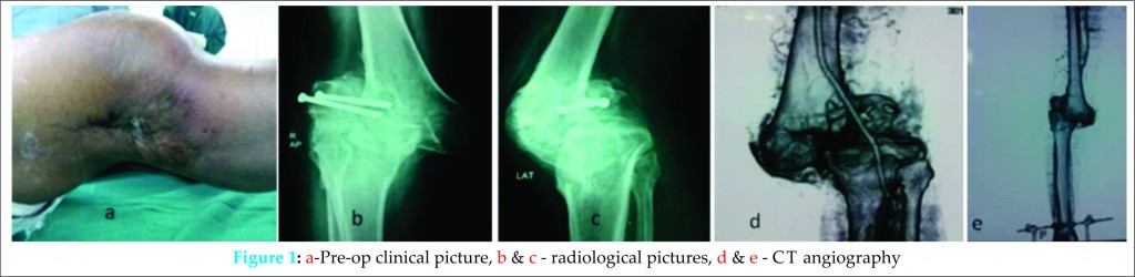 We report a 48 year male patient with a history of fracture lateral femoral condyle of right knee due to road traffic accident 10 years back, for which he had been operated with open reduction and internal fixation with cancellous screws, which subsequently got infected. He had repeated trauma to the limb two years post surgery and this time was treated conservatively in a plaster cast. For last eight years he had a downward spiral in knee function . On presentation to our clinic one year back, he had pain in the right knee, inability to bear weight and varus deformity along with discharging sinus (Fig-1a). He was barely able to take a few steps without support and had constant pain. On examination, the knee was swollen with mild effusion, skin was adherent to the bone with puckering, 20 degrees of varus deformity, gross medio-lateral instability and patella was fixed in the lateral gutter. The distal neuro vascular status was intact. On radiographic examination, the knee was postero-laterally sub-luxated (Fig1 b,c). CT angiography was done to chalk out the course of the popliteal vessels (Fig-1d,e).