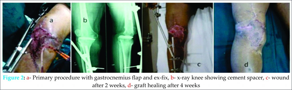 Initially he was on distal tibial skeletal traction to address the mal-alignment but to no avail. Then we planned for a multi staged surgery after proper haematological workup along with culture from the wound site. In the first stage, implants were removed along with debridement of the infected granulation tissue, necrotic lateral femoral condyle was removed , antibiotic cement spacer was given, adherent and puckered skin was excised followed by medial Gastrocnemius myocutaneous flap and a temporary joint spanning external fixator was given (Fig-2a,b) . The patient received four weeks of IV antibiotics and regular wound dressing which led to complete healing of the soft tissues along with normalization of the infection markers (Fig-2c,d).