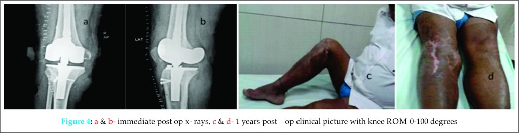The pre-operative Knee Society Scores for pain and function were 30 and 40 points respectively, and improved significantly post-operatively to 80 (pain) and 76 (Function) points respectively at latest follow up of 3 years. The knee ROM significantly improved from Pre-op 30 degree flexion to 100 degree flexion. There was no evidence of infection or aseptic lysis (Fig-5).