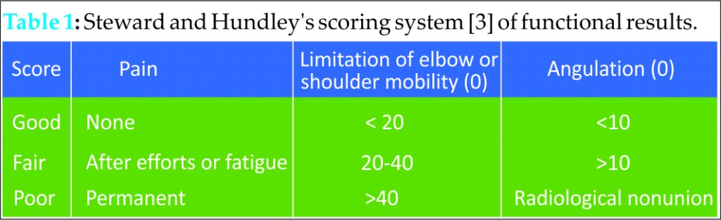 The immediate postoperative radiographs showed satisfactory alignment with secure fixation in both anteroposterior and lateral planes (Fig. 4a). The culture study showed no growth of microorganisms and the histological examination revealed macrophages with intracellular black particulate matter. The skin incisions were healed by primary intention. There was no distal neurovascular deficit or graft donor site morbidity. Functional range of motion of the shoulder and elbow was regained by six weeks of supervised physiotherapy. The nonunion site healed in five months(Fig. 4b). At the final follow up of 24 months, the radiograph showed consolidation of the nonunion.She regained all the movements except for the terminal 10° of elbow extension and 15° of shoulder abduction.The final shortening of her operated arm segment was two cm. According to Stewart and Hundley classification3(Table 1) the final result was found to be good.