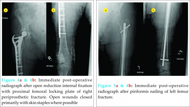 She was brought to the operating room urgently (within 3 hours from time of arrival) and underwent irrigation and debridement of all open wounds and definitive fixation of her femur fractures. A 4.5 mm 12-hole LCP plate was used for the right open periprosthetic fracture (Fig 4), and a 12 mm Zimmer piriformis nail was used for the left femur (Fig 5). Preoperatively, the cement mantle was examined via radiographs and appeared intact, and this was confirmed intraoperatively. An intraoperative plastic surgery consult was undertaken due to severe injury to the soft tissues. Where possible, the soft tissues were primarily closed with sutures or staples, and dressed with Jelonet and soft roll if primary closure was not possible. By the end of the case the patient had received in total 12 units of PRBCs, 4 units of fresh frozen plasma (FFP), 1 unit of platelets, and 1 unit of cryoprecipitate; she was started on dobutamine for pressure support. She was taken to the ICU for further hemodynamic stabilization.
