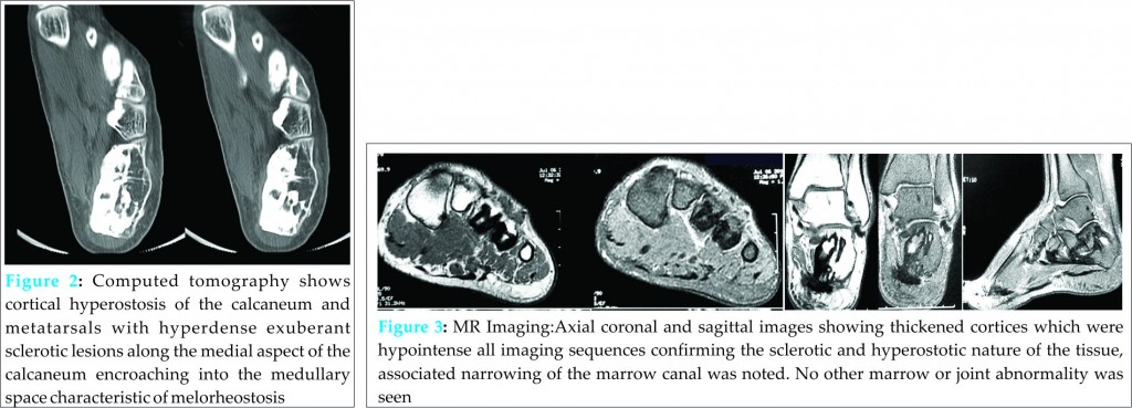Melorrheostosisis a rare benign, sclerosing mesodermal dysplasia that affects the skeleton and adjacent soft tissues, with an incidence of 0.9 cases per million affecting both sexes equally [4]. It was first described by Leri and Joanny in 1922 who described it as “’hyperostose en coulée’ i.e. flowing hyperostosis resembling candle wax [5]. Although a benign condition, the osseous changes can cause significant morbidity [6]. Various theories have been put forward to explain the aetiology of the disorder. The most accepted theory is the classic theory of Murray and McCredie which linked melorheostosis with thescleretomes and proposed that it might be the result of a segmental sensory lesion due to specific infection, insult, or injury to a segment or segments of the neural crest during embryogenesis [7]. Recently, Hellemens et al have demonstrated that a loss-of-function mutation in LEMD3 (on chromosome 12q) is associated with osteopoikilosis, BOS, and melorheostosis [8]. It predominantly affects the appendicular skeleton particularly the long bones of the upper and lower extremities, the lower limb being affected more commonly [2,9]. There is a predilection for the diaphyseal and the epiphyseal regions of the long bones [10]. A review of literature revealed that very few cases affecting the foot have been reported so far.