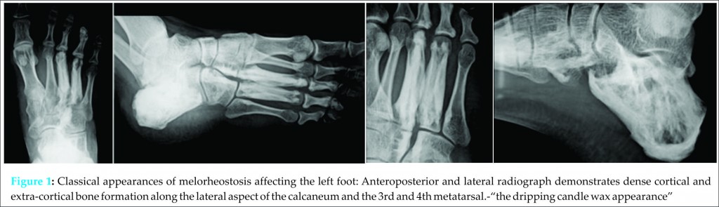 Melorheostosis is a benign bone dysplasia affecting predominantly the appendicular skeleton and adjoining soft tissues. Melorheostosis is derived from Greek: melos = limb, rhein = to flow, ostos =bone. It is diagnosed as incidental radiographic finding in a patient who usually presents as chronic limb pain, swelling and rarely limitation of joint movement. It occurs sporadically and shows typical segmental distribution which has led to the understanding that it is a non-hereditary condition which most probably represents mixed sclerosing dysplasia with disturbance of endochondral and intramembranous ossification [1]. It commonly affects the lower extremity more than the upper [2]. It has been characteristically described as a “flowing hyperostosis” resembling dripping candle wax as an incidental radiograph finding” [2]. The diagnosis can be established on plain radiographs alone and advanced imaging modalities can be avoided. Histology shows nonspecific findings and can lead to erroneous diagnosis [3]. Treatment is mainly symptomatic and conservative.We hereby report a rare case of melorrheostosis affecting the foot with a review of the role of various imaging modalities in the diagnosis of this rare bone dysplasia.