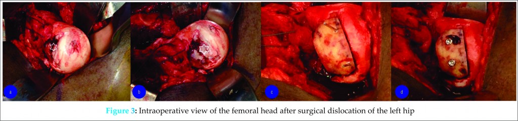 Following confirmation of the reduction using the image intensifier, the graft was secured to the native femoral head with two countersunk 2.7mm cortical lag screws (Fig 3D). The K-wires were removed and the hip joint was reduced. Fluoroscopy confirmed concentric reduction. Range of motion intraoperatively demonstrated a stable and smooth arc of motion with no impingement. The osteotomy was fixated with 3.5 mm cortical screws placed in compression. Following closure of the capsulotomy, the wound was closed in a standard layered fashion.