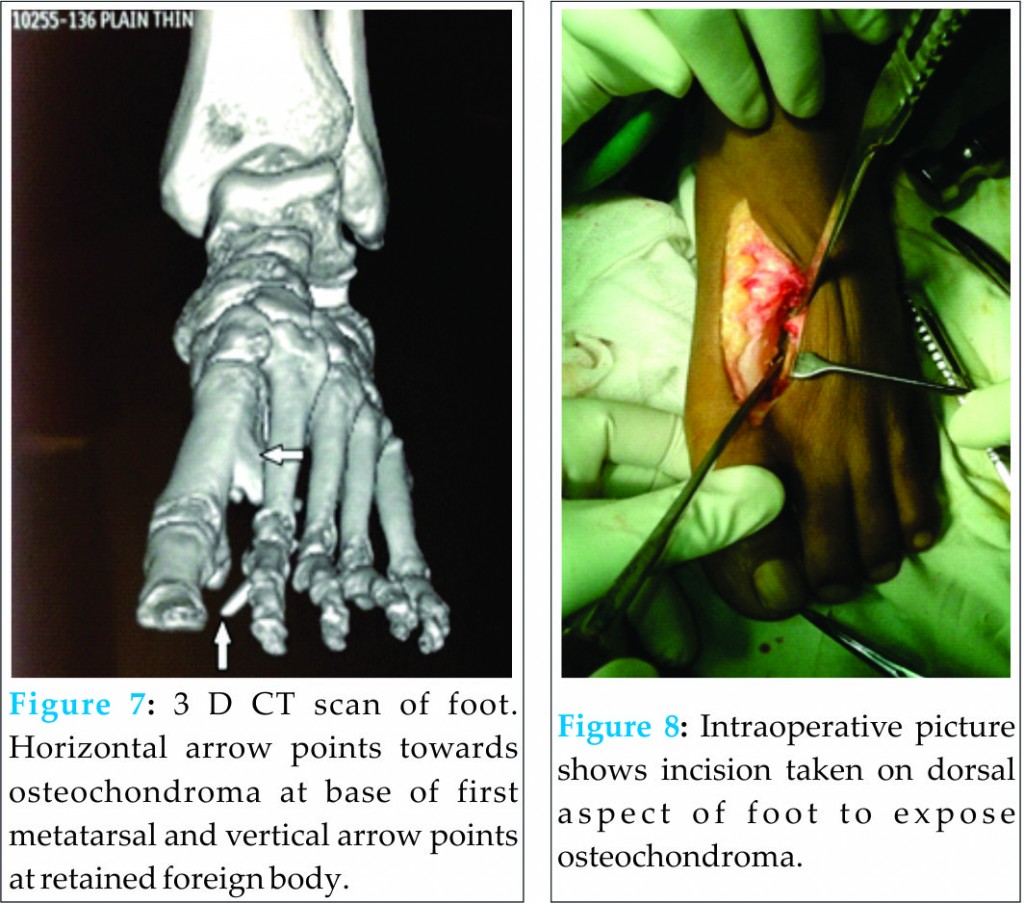 a retained glass piece was identified near the base of first metatarsal. A bony swelling arising from base of first metatarsal was also noted, which was suspected to be osteochondroma. Same was confirmed on CT scan of foot (Fig. 7). Foreign body and bony swelling were excised (Fig. 8). Histopathological examination also confirmed the diagnosis.