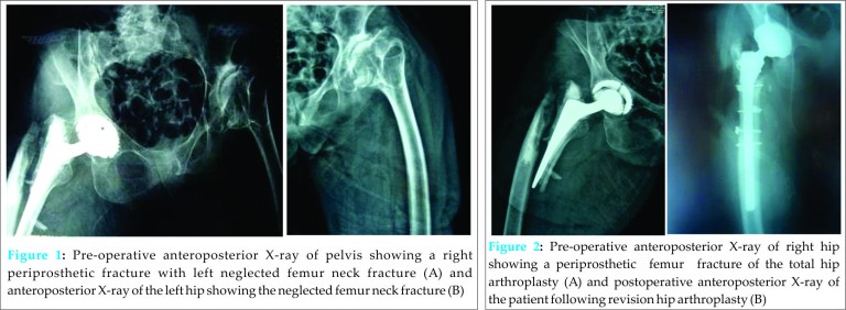 Case Report: A periprosthetic right femur fracture associated with a neglected left femoral neck fracture in the contralateral femur in a 78-year-old elder woman patient is reported in the present article. We discuss the prevention of periprosthetic fractures after hip arthroplasty and address the risk factors associated with this complication.