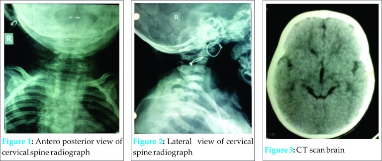 An 8 month old female child was brought to the emergency room after a history of fall on her face from the bed four days back with hyperextension of neck and sudden onset weakness in both upper & both lower limbs. Parents gave the history that the child was all right four days back & was able to stand with support. History of head injury, chest, and abdominal trauma was not reported by the parents.. The child had no history of altered consciousness, vomiting, ear, nose bleed, convulsion, or fever with vomiting and diarrohea. Birth history and perinatal history was not significant. Patient was the second child with one elder sister who was 3 years old and was normal for her age, with no history of prior treatment.