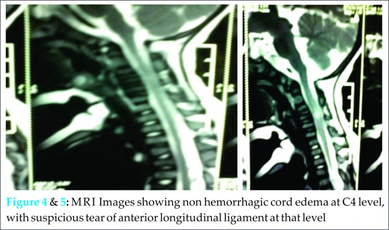 Magnetic ResonanceImaging: Imaging of cervical spine with screening of whole spine: suggestive of non hemorrhagic cord edema at C4 level, with suspicious tear of anterior longitudinal ligament at that level.