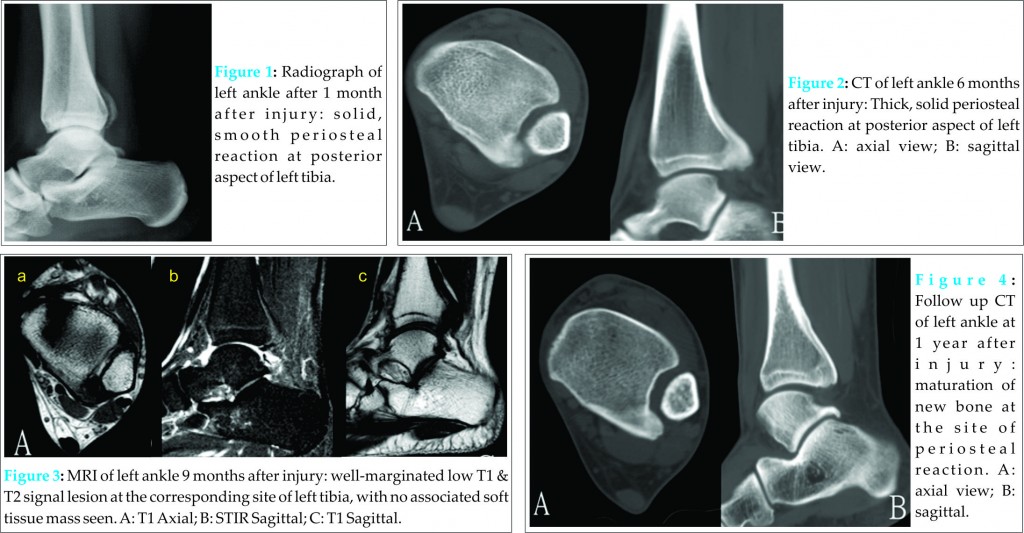 A 25 year old gentleman had an inversion injury to his left ankle. He complained of lateral ankle and posterior heel pain and swelling after the injury. He was treated by a bonesetter and the lateral ankle pain subsided but he still complained of posterior heel pain. He attended our orthopaedic clinic 5 months after the injury. The posterior heel pain had improved by that time. Radiograph of his left ankle revealed solid, smooth periosteal reaction at posterior aspect of left distal tibia (Fig. 1). No definite fracture was detected. MRI showed periosteal reaction at the corresponding site, which was better demonstrated in CT scan (Fig. 2). Follow up MRI at 9 months after the injury (Fig. 3) and CT at 1 year after the injury (Fig. 4) showed maturation of the new bone formation at the site of periosteal reaction. Findings are compatible with subperiosteal hematoma formation from injury, which ossified with time. The patient became asymptomatic 9 months after the injury and there was no more local tenderness or swelling.