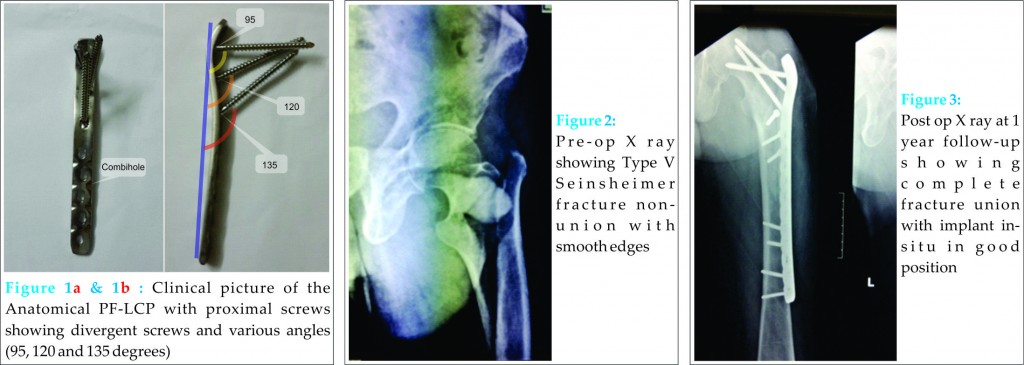 Three locked screws in the proximal fragment at various angles namely 95, 120 and 135 degrees providing multi planar stability [Fig. 1 & Fig.2 ] No loss of bone as no reaming is done as with DCS screws Anatomical so no pre-contouring is required Provision of combi hole to use either locking or cortical screw to achieve plate to bone contact distally. Can be safely used with fracture extension into Greater Trochanter (entry point for nail). We therefore conclude that PF-LCP is a valuable tool in the arsenal of every orthopaedic surgeon. We believe that with the right patient selection, this implant provides a similar result and outcome to that offered by intramedullary devices.
