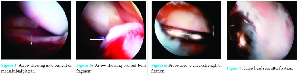 He was treated in cast by orthopedic surgeon. Patient was not comfortable in the cast and came to us. It was a displaced fracture. We did MRI to rule out other injuries [Fig. 3]. Patient was treated arthroscopically under spinal anesthesia in supine position. Anterolateral and anteromedial portals were used. Both the portals should be standard or slightly low as higher portal may put the scope above the fractured fragment and one may not be able to see the fracture clearly. Fractured fragment was clearly defined with the help of a shaver. It also involved significant portion of medial tibial platue [Fig. 4, 5].