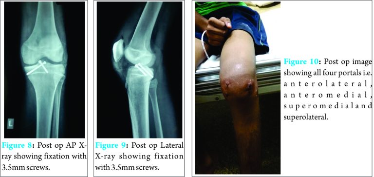 Fracture was reduced with the help of ACL zig and under C- Arm guidance, provisionally fixed with guide wire from superolateral portal taking care not to cross physis. As it was a large fragment, it did not sit completely from medial side so another wire was used from superomedial portal to fix medial side of fragment perpendicular to lateral wire, again without crossing the physis. Two 3.5 mm partially threaded cannulated screws (Zimmer) were directly used; 45mm from lateral side and 35mm from medial side [Fig. 7]. Stability of the fragment was assessed with a probe and was found to be very stable [Fig. 6]. Post-operatively, patient was given a knee brace [Fig. 10].Post-op X-rays showed proper position of both screws [Fig. 8, 9 ]. He was allowed to walk full weight bearing with the knee brace and with support. Knee ROM from 0-90 was allowed for 2 weeks then 0-120 for next 2 weeks. After one month, he was allowed to walk without knee brace. At 6 months, patients was allowed to run. Now we have 8 months follow-up.