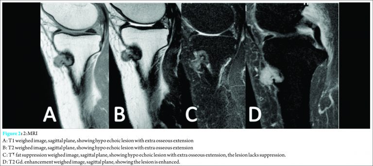Magnetic resonance imaging (MRI) revealed a hypoechoic mass in both T1and T2 weighed mages, not suppressed on T2 fat suppression view T2FS, no fluid-fluid level, it was enhanced with Gadolinium, the lesion had extra osseous extension (Fig. 2a-2d).