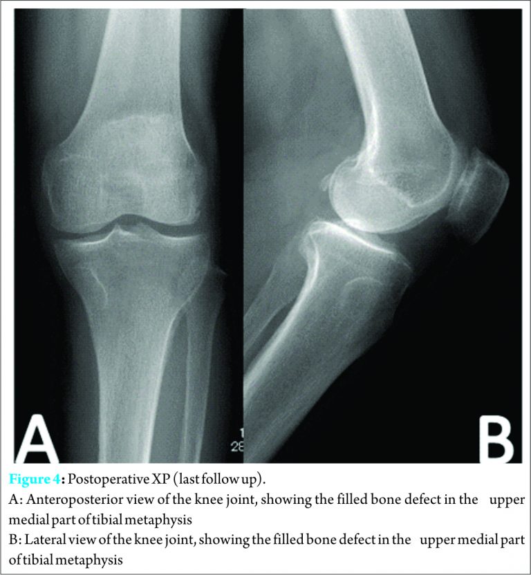 Angioleiomyomas are further classified into three histological categories: solid (the most common type in soft tissues), venous, and cavernous [15]. However, all three patterns are often present within the same tumor. Similarly, reported cases of intraosseous angioleiomyoma showed no distinctive histological features compared to soft-tissue angioleiomyomas [15]. In published cases, three cases out of eleven were histologically angioleiomyoma, two were in tibia and one in the iliac bone. The use of immunohistochemical staining was helpful in this case, the tumor cells stained strongly for muscle markers, including smooth muscle actin and desmin, thus confirming this tumor’s smooth muscle origin. The neoplastic cells did not stain for neural, fibrous, or epithelial markers (S-100, CD34, and AE1/3, respectively). The standard treatment for intraosseous leiomyoma is extensive tumor excision with wide margin followed by packing of the cavity with autologous cancellous bone graft [4]. Internal fixation is required when the residualbony defect is large. Complete excision of intraosseous leiomyoma is typically curative with excellent prognosis. Till now, no cases of recurrences have been reported after complete excision [4,5], however, regular follow-up is necessary to observe the risk of recurrence. In only one of the previously reported cases, reconstruction using bone graft alone was not enough, and reconstruction by TKA was performed due to difficulty in preserving the articular cartilage and thinning out of the bone [8]. Otherwise, all known cases were treated either by en-bloc excision, surgical resection or curettage. In addition to bone graft, and in all cases, results were satisfactory to excellent with no recurrence, malignant change, or distant metastases, early recovery and restoration of function. In our case, we performed wide tumor excision, the bone defect was not large enough to necessitate internal fixation. Patient satisfaction after surgery was good, with improvement of pain, and preserved function of the knee. Pain was completely relieved by two months post-operatively. There was no recurrence, malignant change or distant metastases at the latest follow up visits.