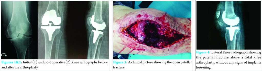 The demographic changes with a high rate of aging and active population, as well as the improved life expectancy during the last decades have led to an increase in the number of total knee arthroplasties (TKA) [1,2,3,4], and consequently a raise of post-operative complications. Among these complications, periprosthetic fracture after TKA is the most frequent cause of post-operative pain, and revision surgery [5]. They may occur in the supracondylar region of the femur, followed by the patella, then the proximal tibia [1,2,3,4,5,6,7]. The rate of periprosthetic patellar fracture is ranging from 0.5 to 3% after TKA [8]. This entity can be very challenging to manage, with unpredictable and poor outcome, especially for displaced fracture or in cases with implant loosening [1,2,3,4,5,8]. In this article, we report a unique case of an open periprosthetic patellar fracture that was managed with operative treatment. It also involves a literature analysis with description of the risk factors and treatment options of this uncommon entity.