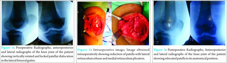 Conclusion: We would recommend that in the settings of patella being vertically dislocated and locked, open reduction would be the management of choice, as these types of dislocations are difficult to relocate by closed reduction. Repeated attempts of closed reduction may cause osteochondral damage. Open reduction not only yields better outcomes but also allows the surgeon to perform patellar realignment procedures in order to prevent further patellar dislocations in cases of prior patellar instability.