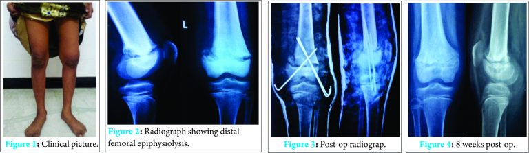 A 12-year-old girl child came with complaints of limp while walking and swelling in the left knee for past 5 weeks (Fig. 1: clinical picture). Mother gave history that the girl is a known case of congenital insensitivity to pain with clear history of no pain on intramuscular injection since birth. The diagnosis was made by our senior neurophysician on the basis of clinical examination and findings of sensory and motor system. The diagnosis of congenital insensitivity to pain is done by positive family history and characteristic symptoms. Nerve conduction studies and EMG has no role in diagnosis of this condition and it was not recommended in this child by our neurophysician. Genetic studies were not done, as it only reflects the way of inheritance and will not add to the diagnosis, but were advised to the parents while counselling. She had no significant trauma, fever, other joint involvement or any features of rheumatism. Physical examination of the skin, nails, heart and lungs were unremarkable. On local examination, she had no bony tenderness, mild warmth, and moderate knee effusion. Range of movement was terminally restricted, with normal distal pulse, power and deep tendon reflex. Pin prick sensation was normal. Plain radiograph showed epiphysiolysis of distal femur with widening of physis (Fig. 2: radiograph showing distal femoral epiphysiolysis). Knee aspirated in emergency department showed straw coloured synovial fluid. Synovial fluid analysis for microscopic and biochemical parameters were normal. Blood tests for infection, clotting profile and arthritis profile markers were normal. Examination under anaesthesia demonstrated gross movement at physis on varus, valgus stress views under fluoroscopy guidance indicating lower femoral physeal separation. This unstable distal femoral epiphysis was treated under general anaesthesia with closed reduction, percutaneous cross pinning [2] and above knee plaster cast (Fig. 3: post-op radiograph). After 8 weeks (Fig. 4: 8 weeks post-op radiograph), the pins were removed in emergency department and knee range of motion exercises started. Twelve weeks follow-up showed complete disappearance of swelling around the knee and child could walk normally with no limp. Radiograph showed increased radio-opacity (healing) at physis. As a measure of prevention of further fractures, we advised her to use preventive splints during any vigorous activity. At 1-year follow-up, the patient was perfectly normal with no signs and symptoms around knee and normal physeal growth.
