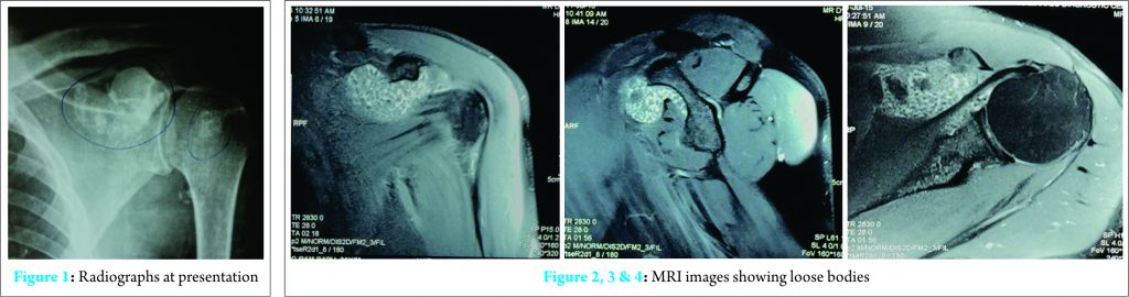 Conclusion: Synovial osteochondromatosis of shoulder joint, subscapular recess and along the long head of biceps is a rare case (less than 5% cases reported till date). Understanding the pathology, recognizing the radiographic and MRI appearance of primary synovial chondromatosis and differentiating it from secondary form, malignancy and other synovial pathologies are important in the diagnosis and clinical management of these patients.