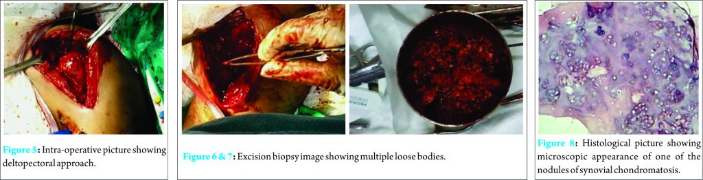 The joint was exposed through a linear incision over the deltopectoral groove[Fig 5]. Excision biopsy of loose bodies was performed [Fig. 6, 7]. Biopsy reported histological features of synovial chondromatosis [Fig. 8]. The wound healed well within 2 weeks and the patient recovered with full range of motion of the affected shoulder. At one year follow-up, the patient does not have any recurrence.