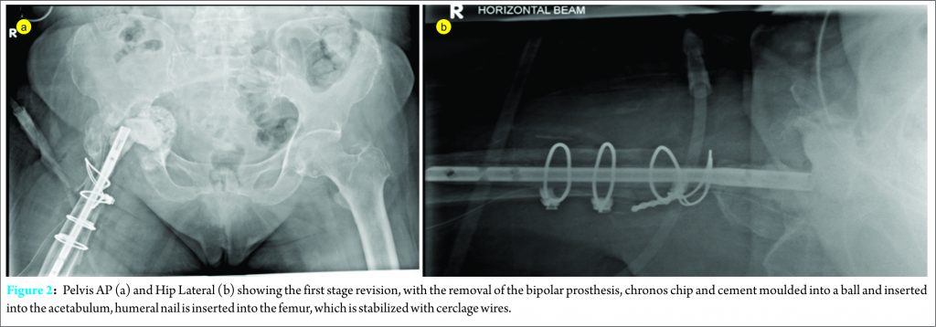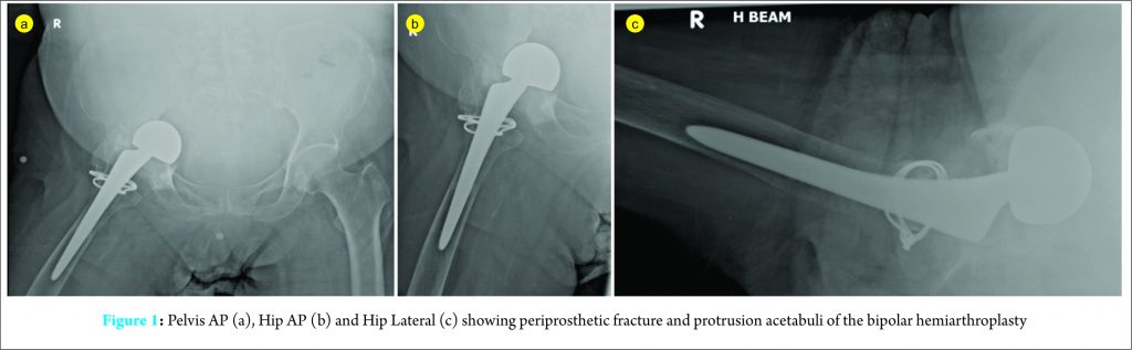 Case Presentation: We present a case report of 60-year-old Chinese female suffering from chronic sepsis of the hip joint causing acetabular prosthetic protrusion with a concomitant peri-prosthetic femoral shaft fracture secondary to a fall, 5 years post index surgery of bipolar hemi-arthroplasty for an intra-capsular neck of femur fracture. This patient subsequently underwent a two-stage revision total hip arthroplasty. We aim to discuss the diagnostic approach and surgical management of this complex case of infected protruded bipolar hip hemi-arthroplasty.
