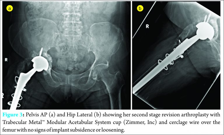 Intra-operative tissue cultures yielded pan-sensitive Citrobacter koseri. Under the advice of infectious disease specialist, the patient was started on long-term intravenous antibiotics (Aztreonam 2 grams Q8 Hourly) for 8 weeks and subsequently oral ciprofloxacin 500mg BD with trending of inflammatory markers. Before the second stage surgery, a CT-guided core biopsy of the right hip was performed to rule out residual inflammation which showed a negative culture. The patient then underwent a second stage revision arthroplasty 4 months after the first stage of revision arthroplasty. Intra-operatively, frozen section of peri-prosthetic tissues revealed no significant acute inflammatory cell infiltrate. The humeral nail and cement puck was removed. The acetabulum was reamed and fitted with Trabecular Metal™ Modular Acetabular System cup (Zimmer, Inc) with rim fit and press fit in 45 degrees inclination and 20 degrees anteversion and secured with two screws. The femur was reamed with tapered reamers and a press fit femoral stem implant was used, which is further stabilized with cerclage wires. Post-operatively the patient underwent physiotherapy and was able to ambulate on post-operative day 4 and was discharged well after one week. At six months post surgery, the patient is, ambulating well, able to do activities of daily living with minimal right hip pain, her follow-up images are shown in Fig. 3(a) and (b).