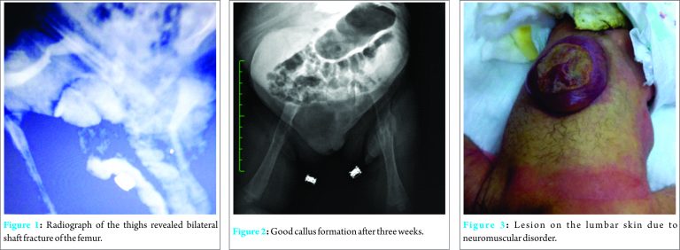 Cesarean section (C/S) is a common and safe procedure for the delivery of fetuses with breech presentation. This procedure prevents trauma and decreases the risk of head entrapment, however femur fractures as a result of birth trauma can still occur during the C/S [1,2]. Alexander et al.reported 0.02% of long bone fracture and 1.1% fetal injury at cesarean section. Moreover, it is reported that the incidence of femur fracture [3] would increase during C/S in the fetus with risk factors such as low-birth weight, macrosomia and neuromuscular disorders [4], thus requiring more attention during labor. Here, we report a newborn with myelomeningocele who was delivered by cesarean section for breech presentation and sustained bilateral fracture of femoral shaft.