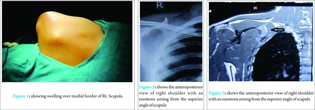 Osteochondroma is the most common primary benign bone tumor that most oftenoccursnear the end of long bone usually solitary (90%), may be multiple in the form of hereditary multiple exostosis (HME) in about 10% of cases [1].This tumor rarely involves flat bones like scapula [2]. However, this is the most common benign primary bone tumor affecting scapula. A scapular osteochondroma may be symptomatic mainly due to its mass effect as it may cause scapular pseudo winging and crepitus and snapping on scapulothoracic motion [3]. Winging of scapula is defined as prominence of medial border or vertebral border of scapula [3,4]. It can be attributed to many causes but most commonly due to paralysis of serratus anterior muscle which needs to be ruled out. These tumors usually affect the growing skeleton and cease to increase in size after skeletal maturity. Any increase in swelling of an asymptomatic swelling turning symptomatic should raise the suspicion of amalignancy. Herein, we describe a case of a 23-year-old patient who presented with a swelling on superomedial aspect of right scapula since 5 years. Diagnostic work up and management along with clinical pictures are included in the case report.