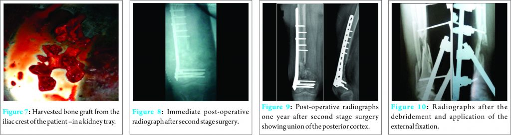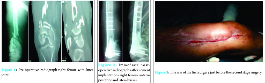 Two open fractures (one distal femur and another open and infected distal tibia) with bone defect treated with antibiotic bone cement in first stage followed by definite bone graft of the defects. Initially wound debridement/sequestrectomy and stabilization of fracture with internal or external fixation with bone cement spacer done. The bone cement is kept in place for 4-6 weeks and in second sitting it is removed and the pseudo-membrane cavity is filled with autologous cancellous bone graft.