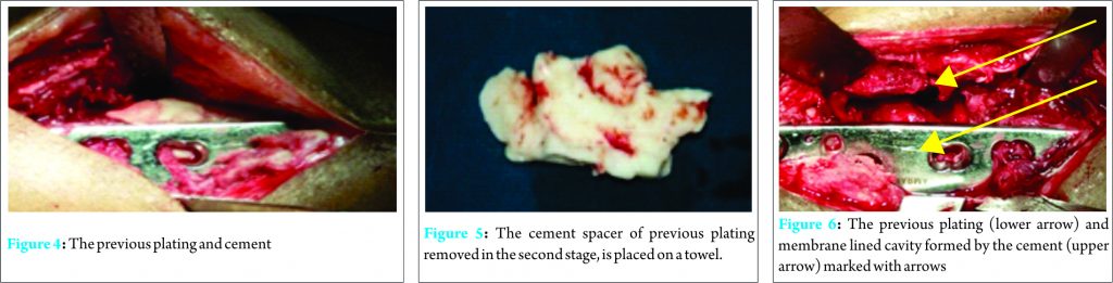 The bone gap created was measured to be 6 cm and is filled with 40g bone cement with 2g Vancomycin as spacer made on the table with a measure from the cavity, using a technique of gauze rolls described [4]. Vancomycin is used because it is heat-resistant. The wound closed over draining tube. Post-operative intravenous antibiotics were given for 2 weeks and oral antibiotics for 1 month. Post-operative period was uneventful. Six weeks later, she was taken to second stage surgery for removal of the cement spacer and grafting. Through incision scar of the previous surgery, the membrane formed around the spacer (Fig. 6) was sharply incised and the cement was extracted out (Fig. 5). Autologous iliac crest cancellous bone graft is harvested (Fig. 7) and the defect is filled and wound closed. Intravenous antibiotics were given for two weeks. At the end of two weeks the wound was healthy and suture was removed. The patient was discharged. The patient was reviewed regularly on 1st, 3rd, 6th and 12th months. Functionally and radio graphically the graft had incorporated into the bone and the continuity was restored at the fracture site (Fig. 2, 8, 9).The range of movement was 0 degree to 90 degree of flexion with full extension.