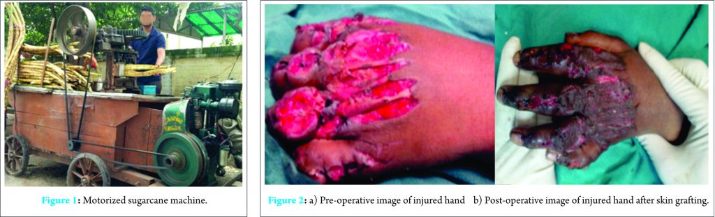Reid defined mutilated hand as the one that “has suffered a severe injury involving loss of substance and has been left lacking in prehension” [1]. These complex injuries with composite soft tissue loss and functional compromise require re-establishment of bony and soft tissue continuity, not only because of the significant loss of soft tissue cover which causes exposure of the deeper structures of hand, but also due to the fact that without such interventions a mutilated hand would remain functionless. The sugarcane machines commonly used in our country have two rollers with irregular surfaces, opposed to each other that are turned either by a handle or an electric motor [ Fig. 1: Motorized sugarcane machine].The sugarcane is kept in-between the two rollers and is churned amongst the rollers. These mutilating hand injuries due to sugarcane machines often occur, when the person is cleaning the machine and this machine is suddenly turned on unknowingly, thus churning the hand in-between its mechanical rollers. The same injury can also occur, if the cloth being used for cleaning the machine gets entrapped amongst the rollers when machine is turned on, therefore, subsequently dragging the hand along with it. The hand gets caught by a force and pulled at a low velocity in-between the rollers of the machine [2]. The irregular surfaces of the roller help the machine onto a firm grip on the hand, in turn pulling the finger tips between the rollers followed by the hand, thus, creating multiple burst lacerations over the fingers. The high energy force leads to fractures, opening of joint capsule, and severe soft tissue injuries.